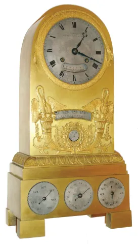 Berrolla, Rue Grenetat N. 4, a Paris, very unusual gilt bronze table or mantel clock with calendar, phases of the moon and retrograde displays, 8 day time and strike pendule a Paris movement signed Pons on front plate, snake form bezel and silvered Roman numeral dial with aperture below center showing retrograde seconds, aperture in case front with scalloped edge displaying retrograde date, a round aperture below trimmed with gilt leaves and flowers showing phases of the moon, the moon disc painted with a smiling face and backed by a dark blue enamel sky with stars, these displays flanked by swans and cornucopias and other Grecian ornaments, the base with 3 silvered dials with scalloped edges, showing day of the week, date, and month, all dials with blued steel hands, the whole on rectangular feet, c1825 Case very good with minor rubs and scratches, gilding good with minor losses, dial with minor scratches and uneven toning, dial figures and signature with restoration, minute hand replaced, retrograde displays with minor toning, calendar dials with uneven wear & toning, calendar figures with restoration, movement good, dirty and with minor rust; ticks and strikes, retrograde seconds functional, rod for rate adjustment bent, bell replaced, hammer missing, retrograde date and moon phase not working, needs adjustment, calendar working, Ht 15 3/8"