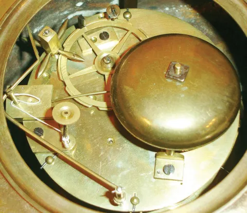 Case very good with minor rubs and scratches, gilding good with minor losses, dial with minor scratches and uneven toning, dial figures and signature with restoration, minute hand replaced, retrograde displays with minor toning, calendar dials with uneven wear & toning, calendar figures with restoration, movement good, dirty and with minor rust; ticks and strikes, retrograde seconds functional, rod for rate adjustment bent, bell replaced, hammer missing, retrograde date and moon phase not working, needs adjustment, calendar working, Ht 15 3/8"