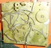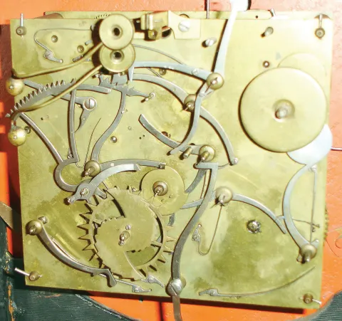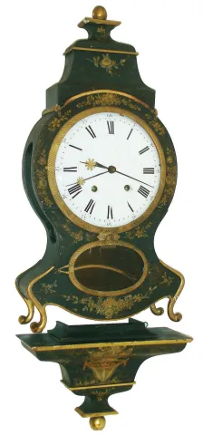 Case with some separation at joints, varnish failing, painted decoration intact, gilding on case painted gold, but much gilding survives beneath the paint, a few losses to gesso on gilt surfaces, door dirty with minor losses to gilding, lower glass present, convex dial glass missing, dial with flakes and chips at winding holes, minor edge flakes, and minor hairlines, dial feet missing, hands good, minute hand with bends, gongs missing, movement missing crutch, 2 pins missing from escape wheel, gathering pallet missing, center arbor broken beyond front plate, hour wheel, cannon pinion and center arbor present, movement oily and dirty, pendulum missing, shelf good with minor touch ups to gilding, varnish failing, painted decoration intact, finial with area of loss at bottom, Ht 35 1/2" with shelf. Although this clock will need restoration, the presence of the original decoration makes it a desirable candidate for such treatment, and well worth the effort required.