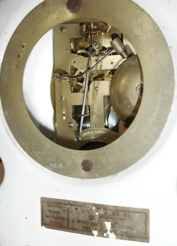 the hand painted case is in excellent condition with no damage or losses. The porcelain dial, fancy brass dial center, beveled glass, and beaded beze...