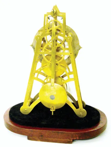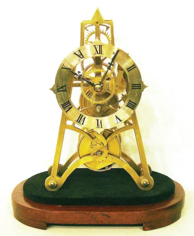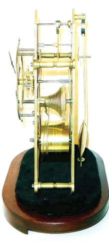 this is a clock of average quality, with 4 spoke wheels, finely shaped pillars and good original lead filled pendulum. Ticking robustly. Ht including wooden base = 11"