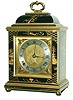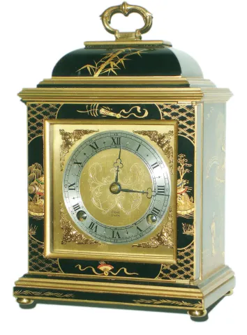 F.W. Elliott, Croydon, England, Japanned wood 8 day time and strike small bracket clock, 1972 the Asian motif decorated case has just a few small worn areas, and the composite signed dial is fine. The heavy signed movement, number 11680, ticks and strikes but the balance-wheel beat sounds like the platform needs attention. Strikes the half hours and a bottom bell. Ht to handle top 10.5"
