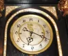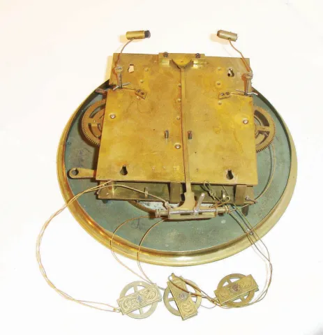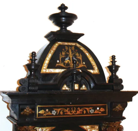 there are some scrapes on the ebonizing, and some corner wear commensurate with the age of this item. Well made movement is complete and sound, and still with strike shut off intact. Pulleys match. Art Nouveau decorations applied to dial center, pendulum and weights, not an exact match, but of the same style. Impressive, and all of the inlay is intact. Note the case will need a new rear hanger for safety.. Ht: 57"