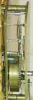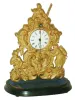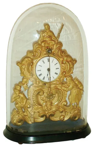 Austria, zappler clock with base and dome, pressed brass case with bright and matte surfaces, decorated with rococo ornament and with three armed male figures, ebonized wooden base on tiny wooden feet, Roman numeral white enamel dial with steel spade hands, 30 hour time only movement with tic-tac escapement and pendulum swinging in front of the dial, all under a glass dome, c1860 Case very good with decorative surfaces intact, missing one small brad used to attach it to the base, dial dirty, with minor scratches, and chips at center arbor, hands with rust, minute hand bent, base very good, one foot replaced, movement running, dome very good, Ht 7" (clock only), 9 1/2" with base and dome