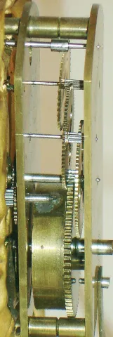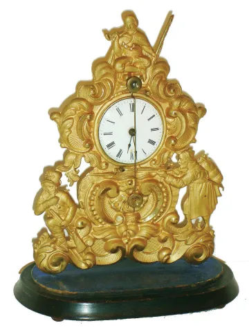Austria, zappler clock with base and dome, pressed brass case with bright and matte surfaces, decorated with rococo ornament and with three armed male figures, ebonized wooden base on tiny wooden feet, Roman numeral white enamel dial with steel spade