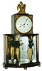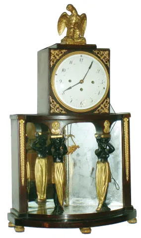 Austrian 60 hour grand sonnerie figural walnut and glass mirror mantel clock, c1850 the elaborate case has no serious losses or damage, and the well-carved female figures and top eagle (repaired at head) retain their gilding. Fancy cast brass ornaments, pendulum and bezel are fine. The porcelain dial also is good, but the calendar pointer is absent. The three-spring movement, with thread suspension, strikes bells on the quarters. Ht 19"