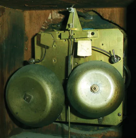 the elaborate case has no serious losses or damage, and the well-carved female figures and top eagle (repaired at head) retain their gilding. Fancy cast brass ornaments, pendulum and bezel are fine. The porcelain dial also is good, but the calendar pointer is absent. The three-spring movement, with thread suspension, strikes bells on the quarters. Ht 19"