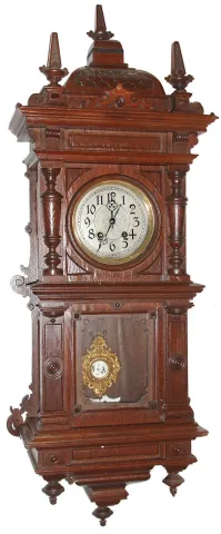 Lenzkirch, Germany, walnut 8 day quarter strike petit sonnerie wall clock, c1901 the ornate case has an old finish, with a few veneer chips and some finials needing repair and reattachment. The silvered dial has some tarnish. The porcelain beat scale, R/A grid iron pendulum, and ornate gong stand are fine. The signed movement is numbered "one million" 284765. The seat board retaining screws are absent, so note that movement on its board is free to slide out. Ht 49"