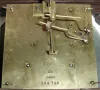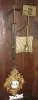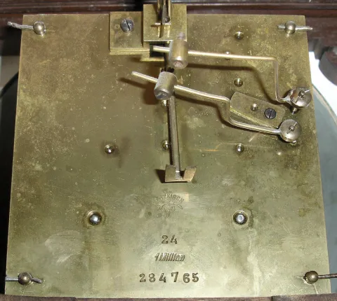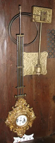 the ornate case has an old finish, with a few veneer chips and some finials needing repair and reattachment. The silvered dial has some tarnish. The porcelain beat scale, R/A grid iron pendulum, and ornate gong stand are fine. The signed movement is numbered "one million" 284765. The seat board retaining screws are absent, so note that movement on its board is free to slide out. Ht 49"