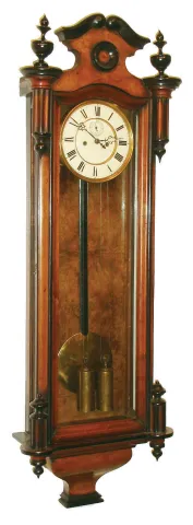 Vienna regulator wall clock, 8 days, time and strike, two brass weight driven movement in a walnut and burled walnut veneer case with ebonized trim and two part white enamel dial and second's bit, c1900 serial #57145 the case has some minor veneer chips. The dial is restored and the minute hand has a solder repair. The two upper finials are replacements and there are minor age splits in the case. This example has a great look. Ht 48"
