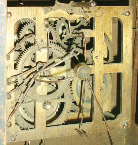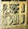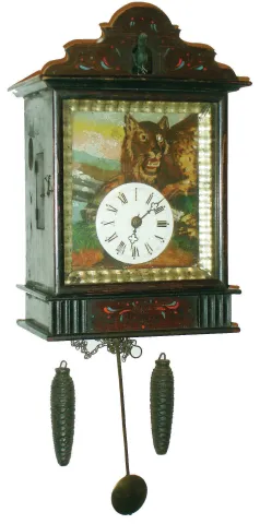 German Black Forest, PHS, "Augenwender" moving eyes and cuckoo two weight 30-hour painted wood wall clock, c1850 this clock is a rare combination of moving eyes, in a large feline, and cuckoo, made for the Asian market. The surface and paint are old, with some flaking, and the cat is well drawn. The porcelain dial has some hairlines. The cast plate movement has the PHS running hare trademark, and the bellows will need renewal. The carved wood bird is detached and not original, and its little door is absent. More information is in Justin Miller's important 2012 book "Rare and Unusual Black Forest Clocks". Ht 14.5"