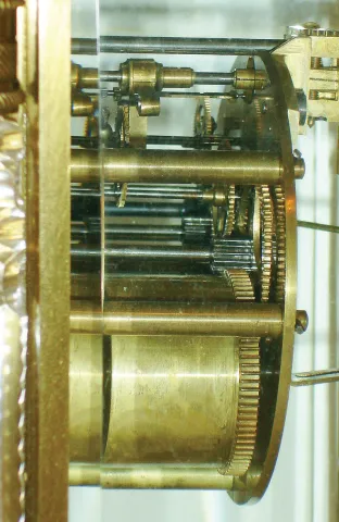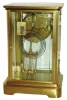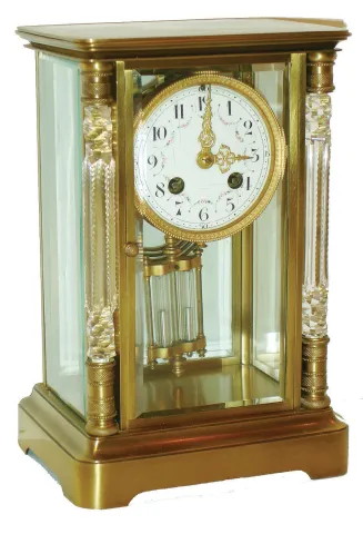 France, unusual crystal regulator, brass case with beveled glasses, the front door flanked by cut glass columns with engine turned capitals and bases, gilt bead and leaf ornamented bezel with Arabic numeral white enamel dial decorated with floral garlands, gilt Louis XV hands, 8 day time and strike pendule a Paris movement with Brocot escapement and coil gong, movement signed F. Pelissier France, and also with the mark of G. Megnin, gilt pendulum with 2 mercury vials, with key, c1900 Case cleaned and relacquered long ago, glasses good, dial dirty and with a number of scratches, cleaning would significantly improve the appearance, bezel good, hands very good, movement ticks and strikes, strike barrel with staining and what appears to be brass polish residue, pendulum good but dirty, and the steel parts with minor oxidation, Ht 10 1/2"