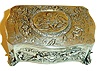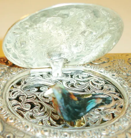 Germany, singing bird box, sterling silver case with serpentine front and sides, scrolled foliate feet, repousse decorated with putto frolicking in landscapes, the brightly colored bird with silver beak emerges from the top when the lever is pushed, does