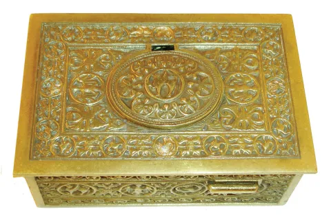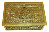 Germany, singing bird box, cast brass case decorated with mythical beasts and scrolled vines, the bird emerging from the box when the lever is pushed, performs for his audience, and then disappears from view, c1980