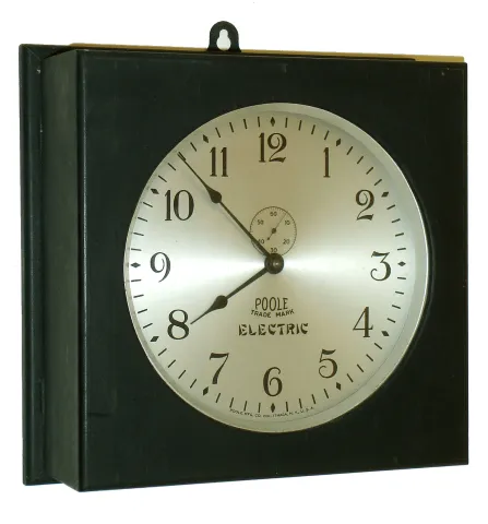 Poole Mfg. Co., Ithaca, New York, square cased, black painted, dc powered, office clock, c1925