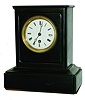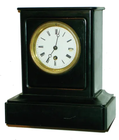 French black marble 8 days, time only mantel clock, c1900 the fairly simple stone case is in nice condition with no losses or damage except for minor edge chips. The white porcelain dial has some damage at III and a few hairlines. The single-train movement carries the Japy Freres Gnd. D'Honneur stamp. Ht 10"
