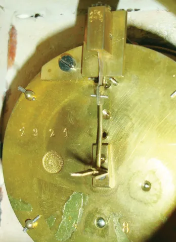 the fairly simple stone case is in nice condition with no losses or damage except for minor edge chips. The white porcelain dial has some damage at III and a few hairlines. The single-train movement carries the Japy Freres Gnd. D'Honneur stamp. Ht 10"