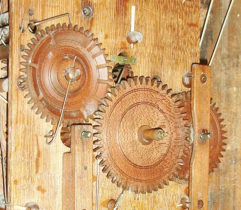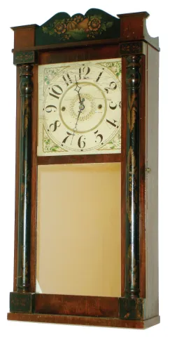 Mahogany veneered case in an old finish with some veneer repairs on the base and remains of the original stenciling on the columns. The top has been restored. Original painted dial with areas of loss on the upper half. Hands are original. Nice label inside the case. Ht 35"