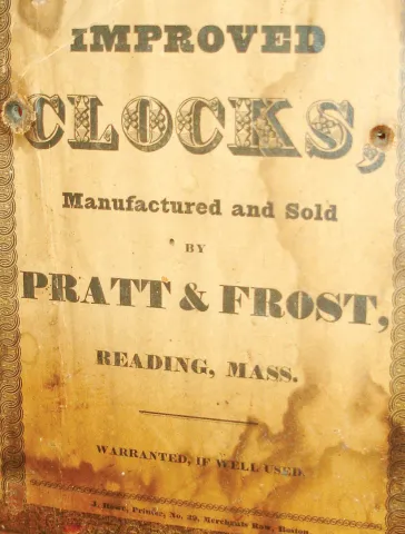 Pratt & Frost, Reading, Mass., 30 hour, time and strike, wood movement, "Groaner" half column and splat shelf clock, 2-wt c1833 Mahogany veneered case in an old finish with some veneer repairs on the base and remains of the original stenciling on the columns. The top has been restored. Original painted dial with areas of loss on the upper half. Hands are original. Nice label inside the case. Ht 35"