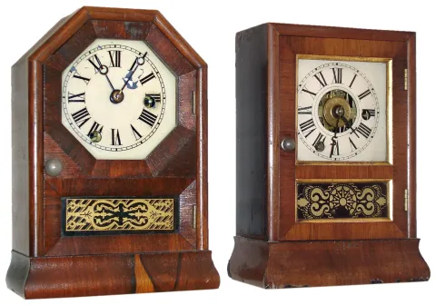 Clocks- 2 (Two) 30 hours, time and alarm spring driven Cottage Shelf clocks manufactured by the Seth Thomas Clock Co., Plymouth Hollow, Conn. c 1860.