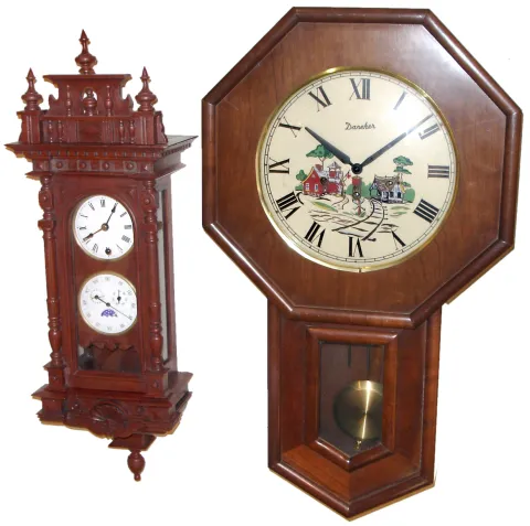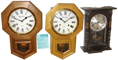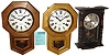 Clocks- 5 (Five) reproduction 8 days, wooden wall clocks: two Korean Montgomery Ward 30-day time and strike, school clocks; Standard time and strike; Daneker 8 days, chiming large school clock; ornate double-dial time and calendar; late 20th century