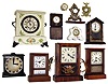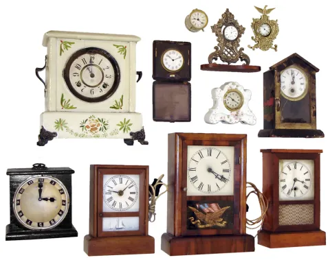 Clocks- 9 (Nine) and Watches in holders- 2 (Two): Optical illusion alarm clock in wood cube case; 30 hours, time only cottage clock; plug-in Spartus electric time only cottage clock; New Haven cottage clock converted to plug-in electric; New Haven 8 days, time and strike, painted wood mantel clock; German 30 hours, time only porcelain novelty clock; Ansonia small time only painted wood pointed top cottage clock with round movement; Tiffany 8 days, travel clock in leather case with Waltham 7 jewel movement; two cast metal watch holders with Swiss pocket watches mostly complete and restorable. Sold as is, no further details available. Largest is 13" high