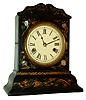 Litchfield Mfg. Co., Litchfield, Conn.30 hours, spring driven time and strike, paper mache and MOP inlay shelf clock, c1850. The paper mache and MOP inlay case is very nice condition. The dial has been repainted and one of the hands is a replacement. The movement is a replacement as not a Litchfield type. The majority of a very nice label remains on the back of the case. Ht 11".