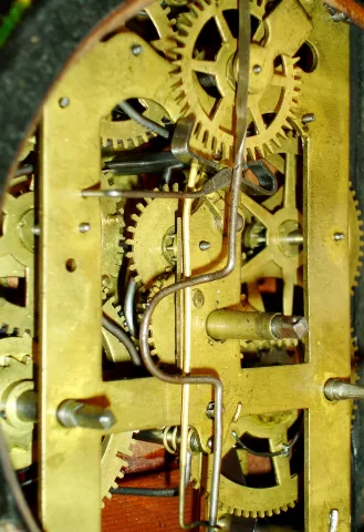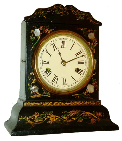 The paper mache and MOP inlay case is very nice condition. The dial has been repainted and one of the hands is a replacement. The movement is a replacement as not a Litchfield type. The majority of a very nice label remains on the back of the case. Ht 11".