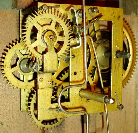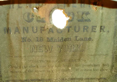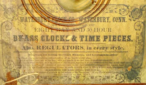 The Waterbury Clock has a refinished mahogany veneered case with very nice upper and lower glasses. The case has some damage to the upper left molding...