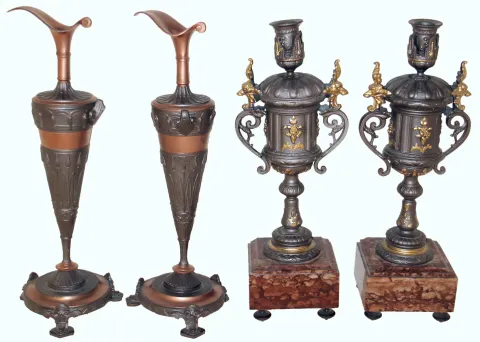 Clock Side Pieces: 2 pairs of mantelpiece cast metal and marble accessories: two candlesticks and two urns, early 20th century the metal finishes on both pairs have been nicely restored, and there are a few tiny corner chips on the two marble bases. Attractive on their own or matched with clocks. Hts 16.5"