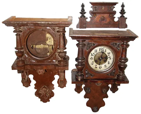 Clocks- 4 (Four) German walnut open well "Berliner wall clock cases, three with 8 days, time and strike, movements, one is case-only, late 19th century