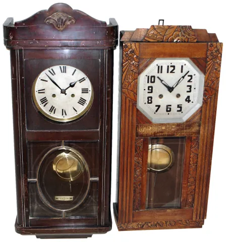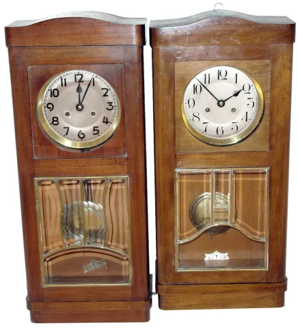 Clocks- 4 (Four) German wooden 8 days, time and strike, wall clocks, beveled glass in doors, early 20th century