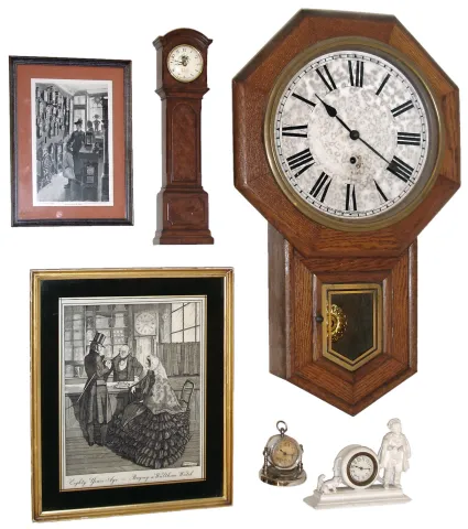 Mixed Lot of 6 (Six) Items: Sessions "Clinton" oak time only 8 days, school clock; English miniature grandfather clock with quartz works, dated 1991; white painted iron small figural 30 hours, novelty clock; German chrome plated swiveling 30 hours, desk desk clock; framed engraved print of clock shop by Merrill; and framed lithograph of "Buying a Waltham Watch". sold "as is".