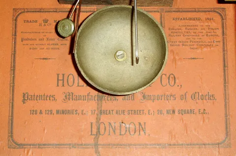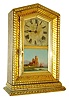 Anglo-American, Holloway & Co, London, 8 days, time and strike, gilt ripple molding shelf clock c1860. Case houses an unsigned American movement possibly made by Ansonia. Gilt case with birds eye maple veneer on the case sides is in nice condition with wear to gilt area at the door knob. Paper dial on a metal base looks to be original, but has age darkened and is stained. The dial looks to have coating of varnish or shellac. Tablet looks to be original. The movement looks to be original to this case, but has a lifting lever for an outboard alarm that may have never been used. Hands appear to be original. Nice clean label inside the case. Ht 17"