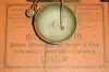 Gilt case with birds eye maple veneer on the case sides is in nice condition with wear to gilt area at the door knob. Paper dial on a metal base looks to be original, but has age darkened and is stained. The dial looks to have coating of varnish or shellac. Tablet looks to be original. The movement looks to be original to this case, but has a lifting lever for an outboard alarm that may have never been used. Hands appear to be original. Nice clean label inside the case. Ht 17"