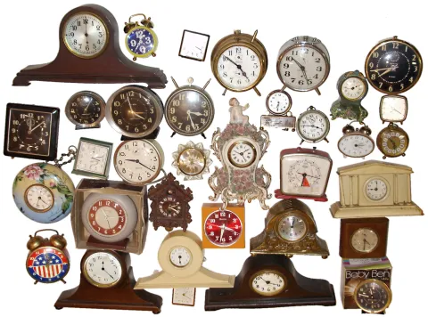 Clocks- 30+ (Thirty-plus) small mantel, novelty, and alarm clocks, mostly American 20th century