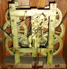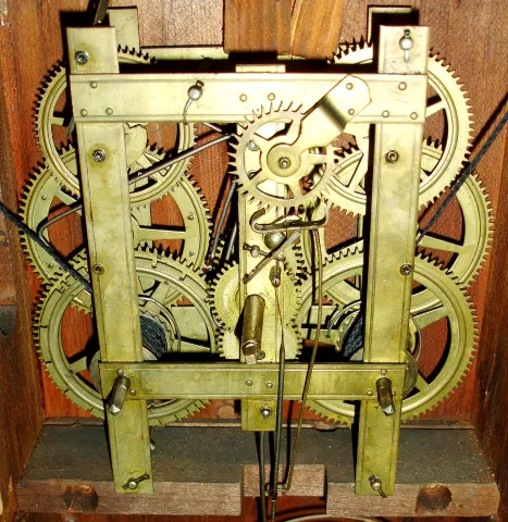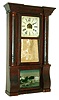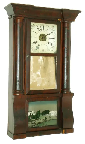 Mahogany veneered case in an old and possibly original finish with some veneer loss on the base, just below the cornice, and lifting of the veneer on the columns. Bottom tablet is original. Mirror looks to be a replacement. Original painted dial with scattered paint loss. Minute hand is a replacement. Has "Puffing Betsey" label. Ht 32.5"