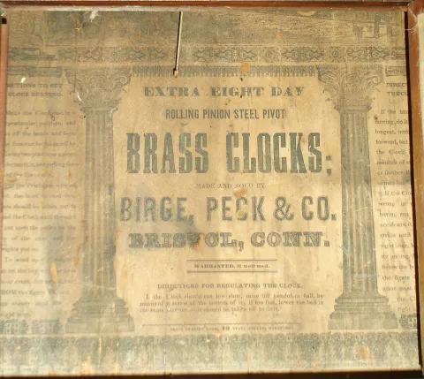 Birge, Peck & Co., Bristol, Conn., 8 days, time and strike, weight brass movement column & cornice shelf clock, c1850 Mahogany veneered case in an old and possibly original finish with some veneer loss on the base, just below the cornice, and lifting of the veneer on the columns. Bottom tablet is original. Mirror looks to be a replacement. Original painted dial with scattered paint loss. Minute hand is a replacement. Has "Puffing Betsey" label. Ht 32.5"