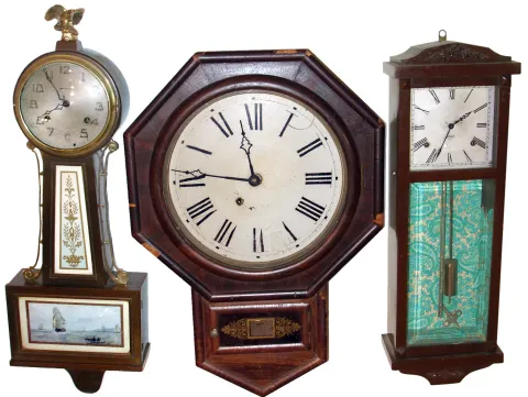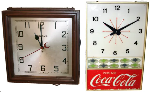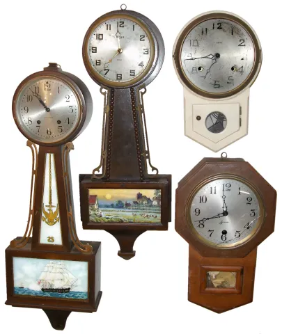 Clocks- 9 (Nine) American wall clocks: two advertising plug-in electrics; others 8 day, Ansonia, Gilbert "Hollywood", New Haven "Whitney", Sessions and Seth Thomas; 20th century