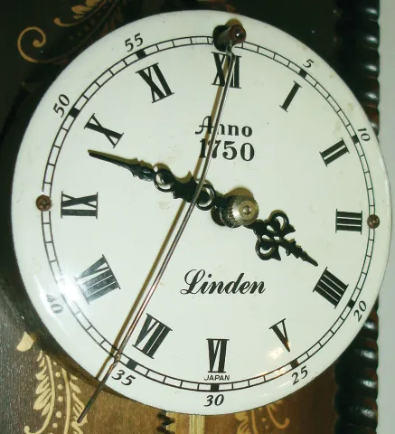 Linden, Japan, modern reproduction stained wood 8 days, gravity wall clock, c1990 this carved and gold printed novelty clock is in very nice condition, with just a few small scratches. The saw tooth runner is fine. The good enamel dial, with "Anno 1750", is also signed Linden, but the cow tail pendulum has been repaired and is missing its end piece. Ht 33"
