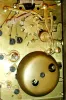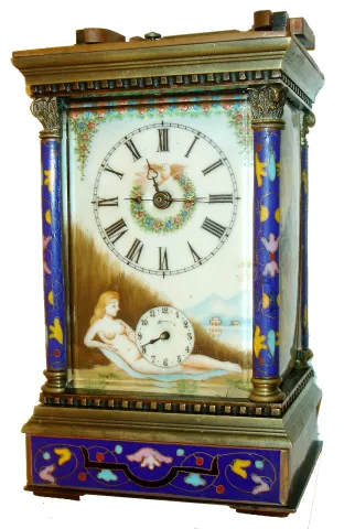 both enameled side panels are damaged, the front beveled glass is chipped at a corner, the replaced minute hand is much too small, and the repeat button does not function. The clock will tick, and strike when poked at the back, but will need service and was not tested further. The original cloth-covered outer box is included. Ht to top of handle 8.5"