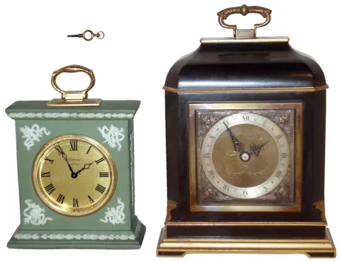 Clocks- 2 (Two) English time only 8 days, desk clocks: Elliott black and gold painted wood small bracket clock with Tiffany brass and silvered dial, dated 1960; Baronet of London green Wedgewood small bracket clock dated 1971