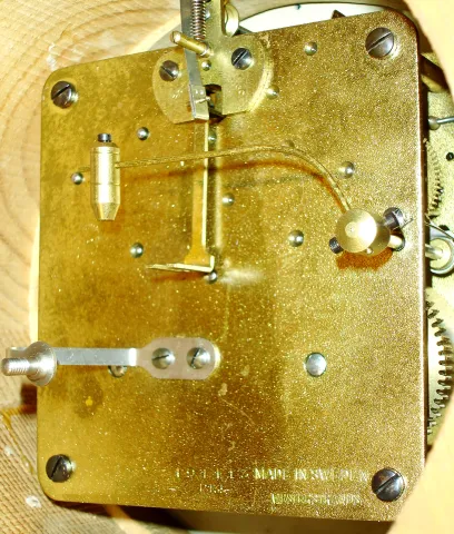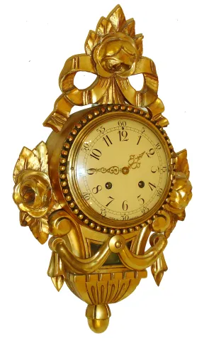 Postwar Swedish cartel clock, gilt case with carved roses, swags, and bowknot, brass bezel with convex glass, Arabic numeral, white painted metal dial, Louis XV style hands, 8 days, spring driven time and strike, movement, c1950. Very nice cartel wall clock in excellent condition overall, a few minor bumps and losses to gilding, ticks and strikes, Ht 20.5".