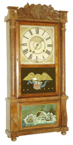 Birge, Mallory & Co., Bristol, Conn., 8 days, time and strike, weight drive, strap brass movement column & carved splat shelf clock, c1845 Refinished mahogany veneered case with some minor damage on the bottom edge of the base. Original painted dial with a narrow band of loss at the bottom at about six o'clock. Both tablets are not original. Hands are original. Movement is signed. Dark, but readable label inside the case. Ht 37"