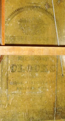 Refinished mahogany veneered case with some minor damage on the bottom edge of the base. Original painted dial with a narrow band of loss at the bottom at about six o'clock. Both tablets are not original. Hands are original. Movement is signed. Dark, but readable label inside the case. Ht 37"