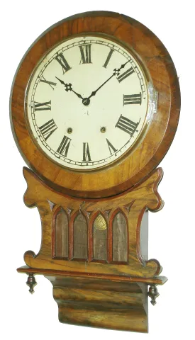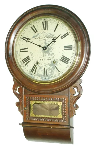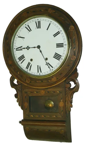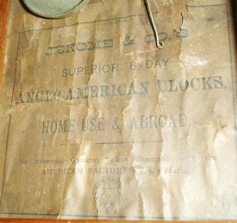 Clocks- 3 (Three) Anglo-American 8 days, time and strike, wooden wall clocks, one with Jerome & Co. inside label, c1890 all three cases are in good overall condition with only slight losses and shrinkage cracks. One dial probably was repainted, another was crudely enhanced, and the third is signed "Clutterbuck" and is flaking. All glasses are present; one is reverse painted. One pendulum bob absent. Hts. 30", 28" and 28.5". Sold as is, no further information available