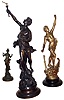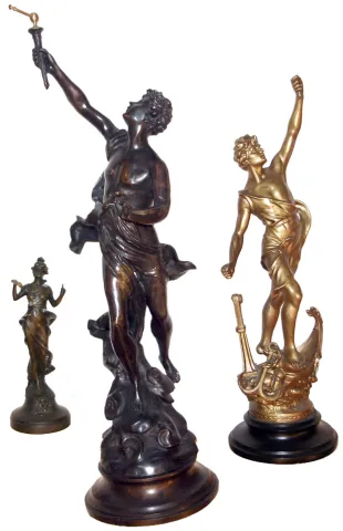 Bases for Swingers- 3 (Three) figural statues (no clock swingering arms included). these are good castings and appear to be old. Each has some slight wear. The largest is quite heavy, smallest has been refinished, with wear, and the male figure has been sprayed gold. Hts 31", 24" and 11"
