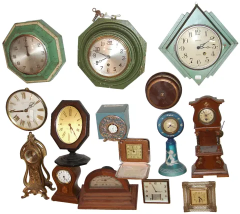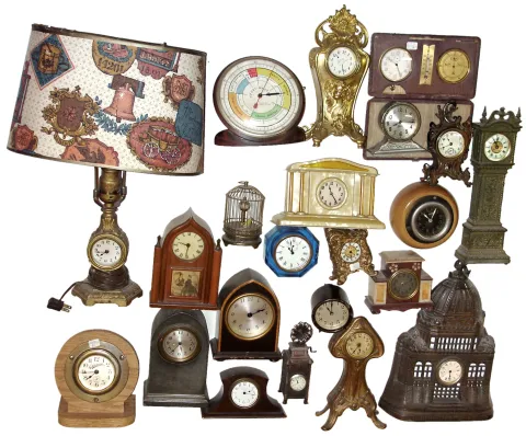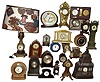 makers include Lux lamp/clock with shade, Welch blue glass, Ansonia, Burroughs, New Haven, Seth Thomas, Waterbury, Keyless Auto, Sessions, Jennings Bros., Syroco, Phinney Walker, Lennox, etc. None tested, sold as is, no further information available