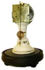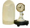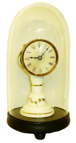 Samuel N. Botsford, Conn., "Candlestick" clock, 30 hours, time only, spring driven movement on a porcelain candlestick pedestal on an ebonized wooden base with dome and papered metal dial, c1855 the clock is in original condition with vertical hairline in candlestick running the length and some wood absent from lip of wooden base. These clocks were NOT made by the Terry Clock Co. or S. B. Terry as often claimed. They were manufactured by Samuel N. Botsford in a business he formed called the Union Labor Company at Southington, CT between 1857 and 1864. Height with dome, 11 1/2"