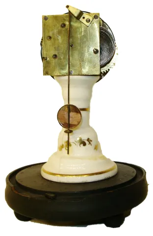 Samuel N. Botsford, Conn., "Candlestick" clock, 30 hours, time only, spring driven movement on a porcelain candlestick pedestal on an ebonized wooden base with dome and papered metal dial, c1855